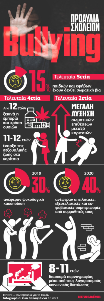«Από τα παιδιά – εφήβους που έχουμε δεχθεί στη Δομή μας παρατηρούνται σταθερά ποσοστά ενδοσχολικής βίας που εκφράζεται με σωματικές επιθέσεις: περίπου το 15% των παιδιών και εφήβων έχουν δεχθεί σωματική βία εντός του σχολικού περιβάλλοντος. Αν και δεν έχουν αυξηθεί οι αναφερόμενες σωματικές επιθέσεις εντός του σχολικού πλαισίου, αυτό που παρατηρείται είναι ότι η ένταση εκδήλωσης της επιθετικότητας από τον θύτη/ες είναι μεγαλύτερη, με αποτέλεσμα την αναγκαιότητα ιατρικής παρακολούθησης του θύματος. Ο ρυθμός αύξησης αυτού του ποσοστού τα τελευταία τρία έτη είναι 10% ετησίως από το 2018 μέχρι και σήμερα. Μεγάλη αύξηση του ποσοστού σωματικών επιθέσεων καταγράφεται τα τελευταία 2 έτη μεταξύ των κοριτσιών, της τάξης του 25%, αλλά λαμβάνει χώρα περισσότερο στο δημόσιο χώρο και όχι τόσο εντός του σχολικού πλαισίου. Τα ποσοστά άσκησης ψυχολογικής βίας και εκφοβισμού κυρίως μέσω του διαδικτύου αυξήθηκαν σημαντικά κατά την περίοδο εγκλεισμού, λόγω των μέτρων προστασίας από τον COVID-19. Το 2019, το 30% των παιδιών και των εφήβων ανέφεραν ψυχολογική κακοποίηση που στις περισσότερες περιπτώσεις ξεκινούσε εντός της σχολικής τάξης και συντηρούνταν μέσω του διαδικτύου. Το 2020, το 40% των εφήβων ανέφερε απειλητικές, εξευτελιστικές και εκφοβιστικές συμπεριφορές από συμμαθητές τους, κυρίως μέσω του διαδικτύου. Ένα ιδιαίτερο χαρακτηριστικό που πλέον απαντάται με μεγαλύτερη συχνότητα είναι η διασπορά πορνογραφίας όχι μόνον μεταξύ εφήβων αλλά πλέον και μεταξύ παιδιών, ηλικίας 8 – 11 ετών, μέσα από τους λογαριασμούς κοινωνικής δικτύωσης».
