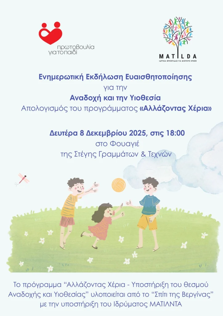 Το “Σπίτι της Βεργίνας” της Πρωτοβουλίας για το Παιδί σας προσκαλεί στην Εκδήλωση Ενημέρωσης και Ευαισθητοποίησης για την Αναδοχή και την Υιοθεσία που θα πραγματοποιηθεί στο Φουαγιέ της Αντωνιάδειας Στέγης Γραμμάτων και Τεχνών τη Δευτέρα 8 Δεκεμβρίου 2025, στις 18:00. Στο πλαίσιο της εκδήλωσης θα παρουσιαστούν τα αποτελέσματα, οι δράσεις και ο κοινωνικός αντίκτυπος του προγράμματος “Αλλάζοντας Χέρια” που υλοποιεί […]