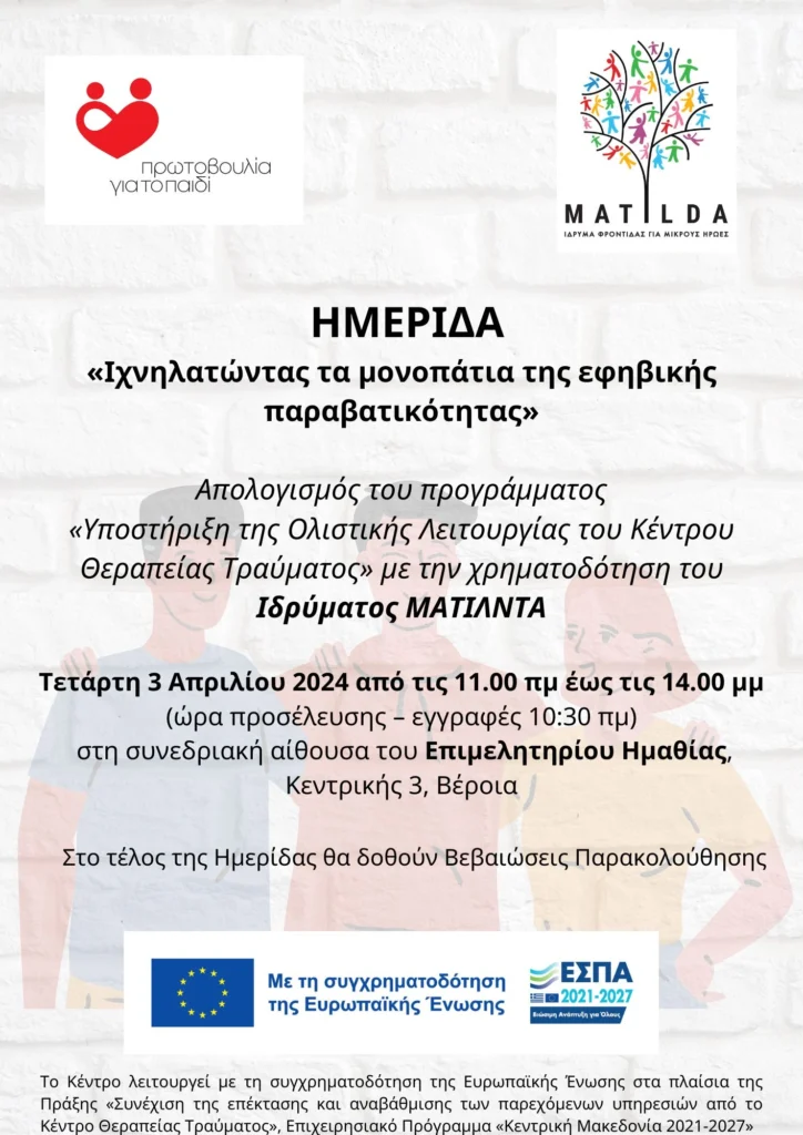 Το Κέντρο Αναφοράς, Παροχής Συμβουλευτικής και Θεραπείας Τραύματος της Πρωτοβουλίας για το Παιδί σας προσκαλεί στην Ημερίδα με θέμα: «Ιχνηλατώντας τα μονοπάτια της εφηβικής παραβατικότητας». Απολογισμός του προγράμματος «Υποστήριξη της Ολιστικής Λειτουργίας του Κέντρου Θεραπείας Τραύματος» με την χρηματοδότηση του Ιδρύματος ΜΑΤΙΛΝΤΑ. Η Ημερίδα θα πραγματοποιηθεί στη συνεδριακή αίθουσα του Επιμελητηρίου Ημαθίας, Κεντρικής 3 στη Βέροια, την Τετάρτη 3 Απριλίου 2024 από […]