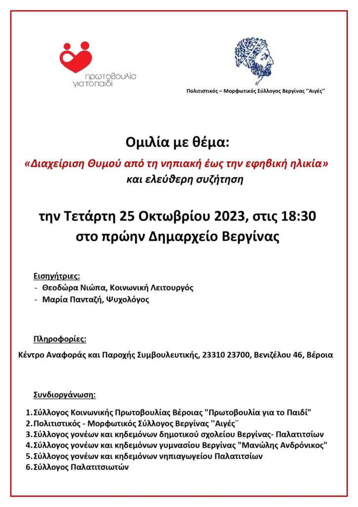 Η Πρωτοβουλία για το Παιδί, ο Πολιτιστικός – Μορφωτικός Σύλλογος Βεργίνας ”Αιγές¨, ο Σύλλογος γονέων και κηδεμόνων δημοτικού σχολείου Βεργίνας- Παλατιτσίων, ο Σύλλογος γονέων και κηδεμόνων γυμνασίου Βεργίνας “Μανώλης Ανδρόνικος”, ο Σύλλογος γονέων και κηδεμόνων νηπιαγωγείου Παλατιτσίων και ο Σύλλογος Παλατιτσιωτών σας προσκαλούν στην Ομιλία με θέμα “Διαχείριση Θυμού από τη νηπιακή έως την εφηβική ηλικία” την Τετάρτη 25 […]