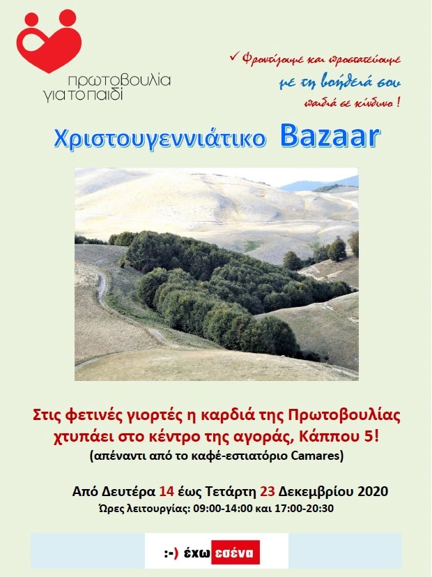 Η Πρωτοβουλία για το Παιδί πιστή στο ραντεβού της, ανακοινώνει το Χριστουγεννιάτικο Bazaar της, που θα γίνει από τη Δευτέρα 14 έως και την Τετάρτη 23 Δεκεμβρίου 2020, στο κατάστημα επί της οδού Κάππου 5 (έναντι καφέ-εστιατορίου CAMARES). Το κατάστημα θα είναι ανοικτό κάθε μέρα από τις 9:00 έως τις 14:00 και από τις 17:00 έως […]