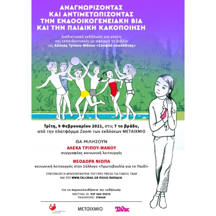 ΕΚΔΗΛΩΣΗ ΓΙΑ ΓΟΝΕΙΣ ΚΑΙ ΕΚΠΑΙΔΕΥΤΙΚΟΥΣΑναγνωρίζοντας και αντιμετωπίζονταςτην ενδοοικογενειακή βία και την παιδική κακοποίηση Τρίτη, 9 Φεβρουαρίου 2021, στις 7 μ.μ.Παρακολούθηση μέσω της πλατφόρμας Zoom των εκδόσεων ΜΕΤΑΙΧΜΙΟ Με αφορμή το βιβλίο της Αλέκας Τρίπου-ΜάνουΣουφλέ σοκολάτας Μολονότι συχνά επιλέγουμε να κλείνουμε τα μάτια μας μπροστά τους, η ενδοοικογενειακή βία και η παιδική κακοποίηση, σωματική και ψυχολογική, όχι […]