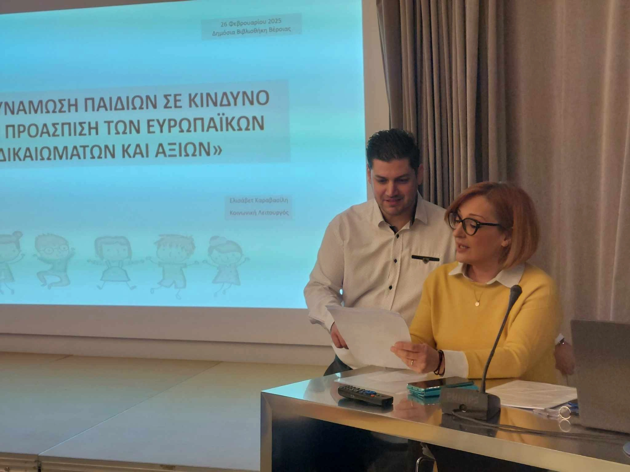 Την Τετάρτη 26 Φεβρουαρίου πραγματοποιήθηκε στη Δημόσια Κεντρική Βιβλιοθήκη Βέροιας η ενημερωτική εκδήλωση παρουσίασης των αποτελεσμάτων του έργου με τίτλο «Ενδυνάμωση παιδιών σε κίνδυνο στην προάσπιση των ευρωπαϊκών δικαιωμάτων και αξιών», το οποίο υλοποιήθηκε από την Πρωτοβουλία για το Παιδί στο πλαίσιο του προγράμματος «Προστασία και προώθηση των δικαιωμάτων και των αξιών της Ευρωπαϊκής Ένωσης» BUILD του Ιδρύματος Μποδοσάκη. Η εκδήλωση ξεκίνησε με μια σύντομη αναφορά στις δράσεις του Οργανισμού και στη λειτουργία των δομών του και παράλληλα, παρουσιάστηκαν από την Κοινωνική Λειτουργό, κ. Καραβασίλη Ελισάβετ οι στόχοι του έργου καθώς και τα αποτελέσματα αυτού. Στη συνέχεια, ο Κοινωνικός Λειτουργός του Κέντρου Ημερήσιας Φροντίδας και Στήριξης Οικογένειας, κ. Μελιόπουλος Μιλτιάδης παρουσίασε τέσσερις περιπτώσεις συνηγορίας και υπεράσπισης των δικαιωμάτων των ωφελούμενων παιδιών του Οργανισμού. Κατά τη διάρκεια της ενημερωτικής δράσης είχε προβλεφθεί η λειτουργία παράλληλου βιωματικού εργαστήριου για τα παιδιά με θέμα τα Δικαιώματα και τις Αξίες της Ευρωπαϊκής Ένωσης.