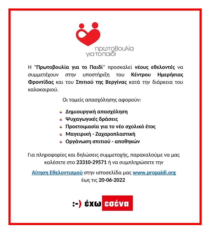 Η “Πρωτοβουλία για το Παιδί” προσκαλεί νέους εθελοντές να συμμετέχουν στην υποστήριξη του Κέντρου Ημερήσιας Φροντίδας και του Σπιτιού της Βεργίνας κατά την διάρκεια του καλοκαιριού.