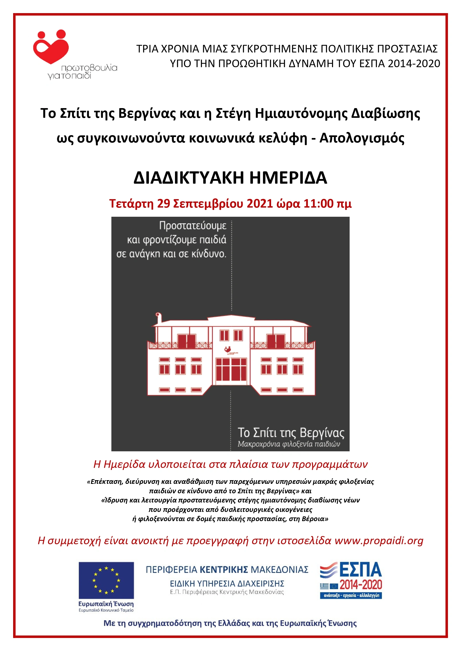 Το Σπίτι της Βεργίνας και η Στέγη Ημιαυτόνομης Διαβίωσης νέων της Πρωτοβουλίας για το Παιδί καλούν το κοινό στη Διαδικτυακή Ημερίδα με θέμα: «Το Σπίτι της Βεργίνας και η Στέγη Ημιαυτόνομης Διαβίωσης νέων ως συγκοινωνούντα κοινωνικά κελύφη – Απολογισμός», την Τετάρτη 29 Σεπτεμβρίου 2021 στις 11:00 πμ. και θα διεξαχθεί μέσω της πλατφόρμας του Microsoft Teams.