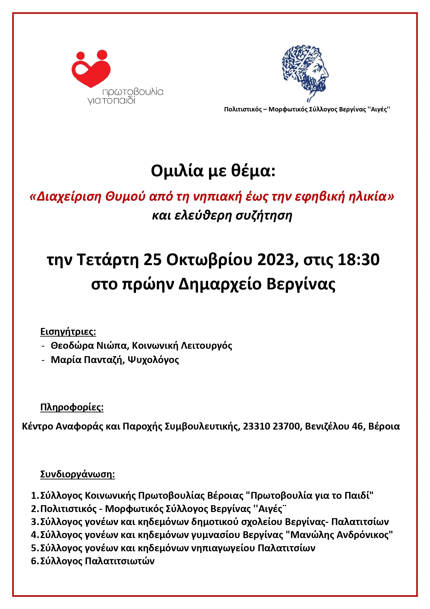 Η Πρωτοβουλία για το Παιδί, ο Πολιτιστικός – Μορφωτικός Σύλλογος Βεργίνας ”Αιγές¨, ο Σύλλογος γονέων και κηδεμόνων δημοτικού σχολείου Βεργίνας- Παλατιτσίων, ο Σύλλογος γονέων και κηδεμόνων γυμνασίου Βεργίνας “Μανώλης Ανδρόνικος”, ο Σύλλογος γονέων και κηδεμόνων νηπιαγωγείου Παλατιτσίων και ο Σύλλογος Παλατιτσιωτών σας προσκαλούν στην Ομιλία με θέμα “Διαχείριση Θυμού από τη νηπιακή έως την εφηβική ηλικία” την Τετάρτη 25 Οκτωβρίου 2023 στις 18:30 στην αίθουσα εκδηλώσεων του πρώην Δημαρχείου Βεργίνας.